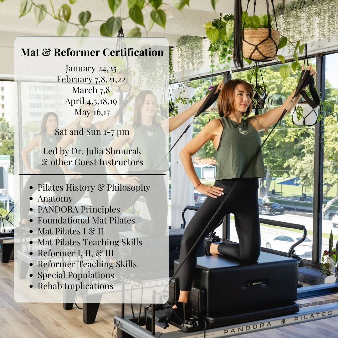 Become a highly qualified Pilates instructor with the most comprehensive Mat & Reformer Pilates Teacher Training Course at Pandora Pilates & Physical Therapy in Miami, Florida. Our program, led by renowned Physical Therapist and 3rd-generation Master Pilates Teacher, Dr. Julia Shmurak, DPT, NCPT, delivers the most in-depth Pilates education in South Florida.